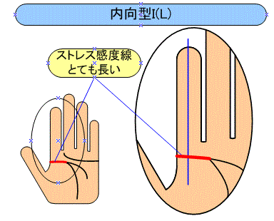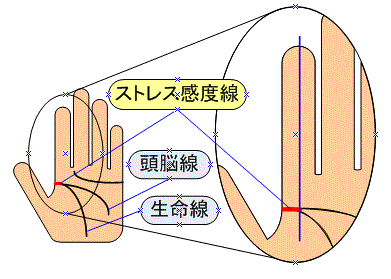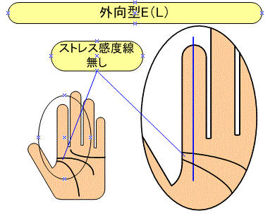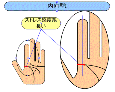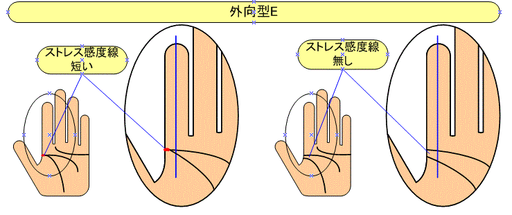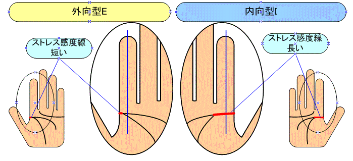 これにより、例えば、長いストレス感度線を持った薄い手相の持ち主は、ストレスに対して敏感であって弱いため、神経症傾向を伴う内向型Iの性格であると考えられます。また、短いストレス感度線を持った濃い手相の持ち主は、ストレスに対して鈍感であって強いため、神経症傾向を殆ど伴わない外向型Eの性格であると考えられます。