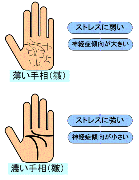 手のひらの皺が濃い場合は、ストレスに強い「濃い手相」の持ち主であり、皺が薄い場合は、ストレスに弱い「薄い手相」の持ち主となります。内向型I及び外向型Eのいずれのストレス感度線の持ち主であっても、皺の濃さによりストレスに対する強度と神経症傾向の程度が異なります。
